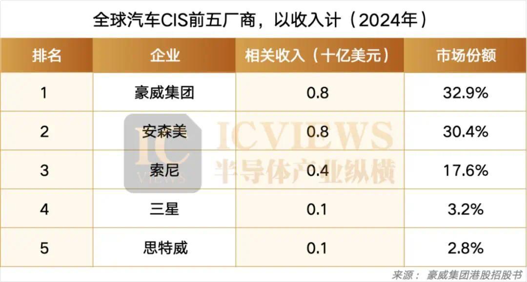 真正到了汽车市场,格局就完全不一样了。汽车CIS不只是参数竞赛,更是车规能力、客户认证、产品节奏和成本控制的综合比拼。当前汽车市场的第一梯队,仍然是豪威、安森美和索尼,三家合计占据了超过七成市场份额;而在第二梯队里,思特威、格科等中国厂商正在快速追赶。